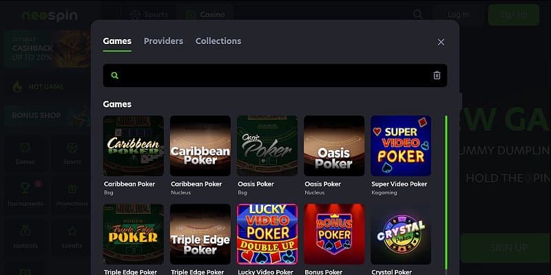 Off-peak, casino poker staples, Caribbean Stud, Teen Patti, Tri-Card, plus a couple of solid video poker titles keep things casual and fun.