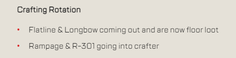 A temporada 12 introduziu armas na fabricação. Removendo a possibilidade de armas favoritas dos fãs, como Flatline e Longbow, de serem espólios do chão e podendo apenas ser fabricadas. Essa mudança foi surpreendente para a maioria, mas reintroduziu o valor da fabricação não apenas para armas, mas para outros itens. Na temporada 13, a R-301 e a Rampage foram inseridas na fabricação.