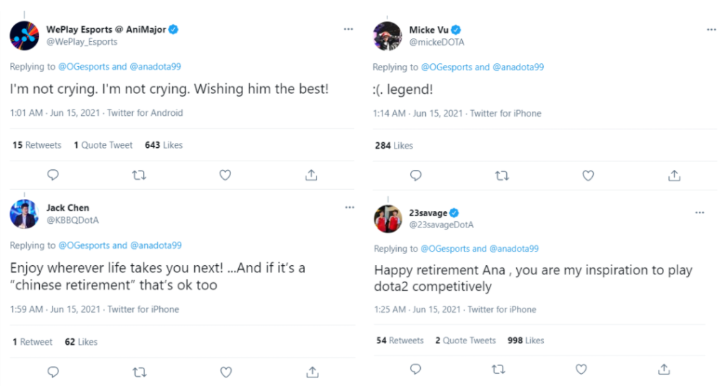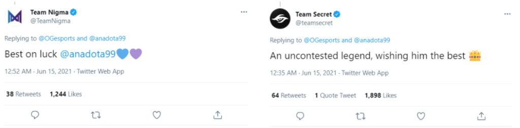 “(OG) sempre será uma casa para mim. Esse jogo sempre terá um lugar especial no meu coração, e eu sou imensamente grato pela comunidade de Dota e pelas pessoas que eu conheci ao longo do caminho.”