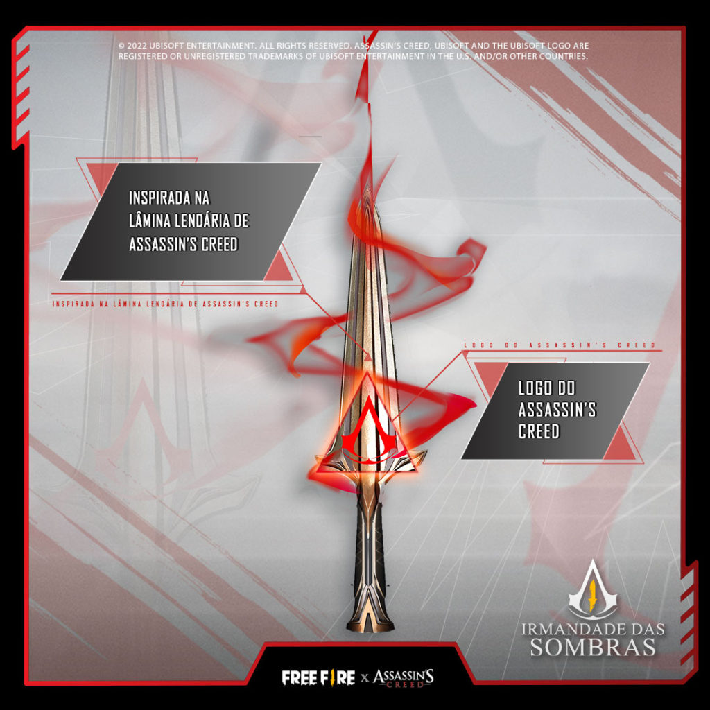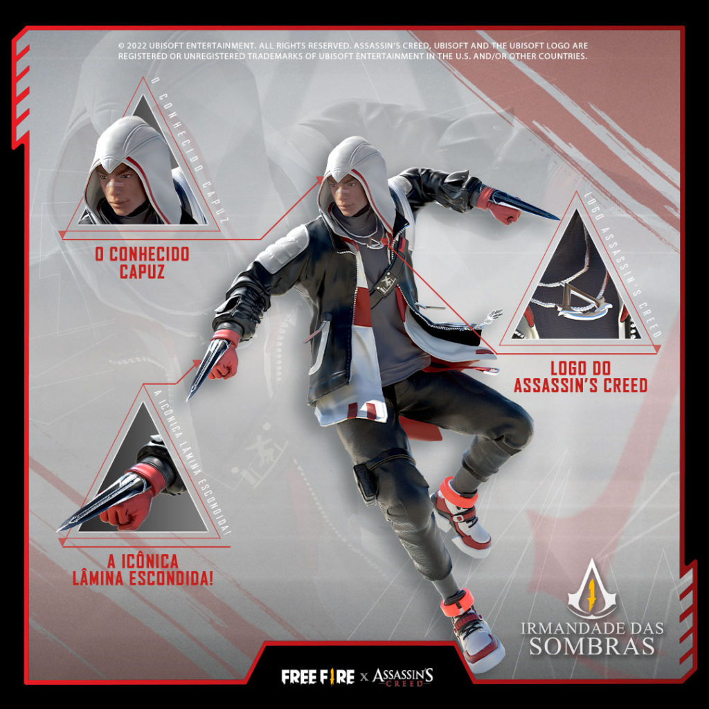 Toda a coleção de Free Fire x Assassin’s Creed foi cuidadosamente pensada e criada para integrar elementos chave de Assassin’s Creed dentro do universo de Free Fire.