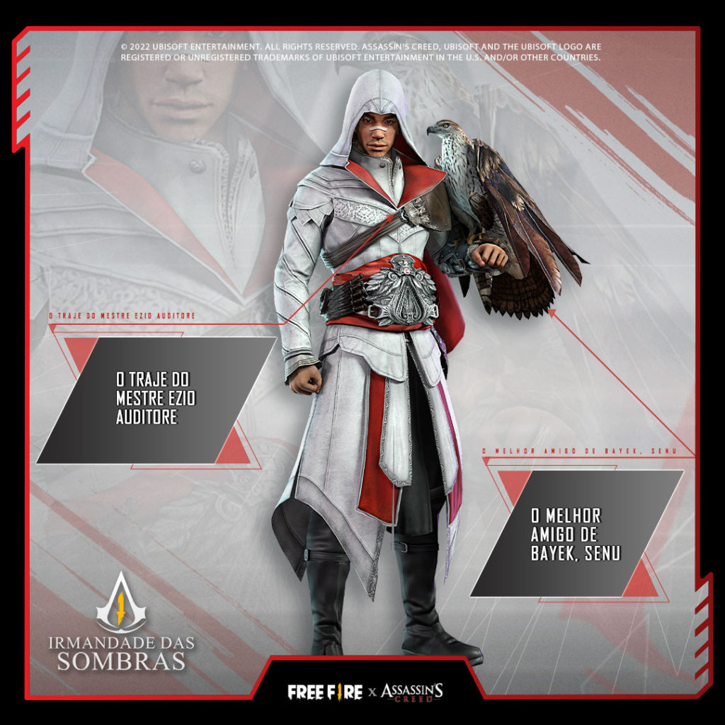 O icônico Mestre de Assassin’s Creed, Ezio Auditore, também estará no Free Fire, junto com Senu, um falcão Bonelli fêmea e a companheira leal de Bayek.