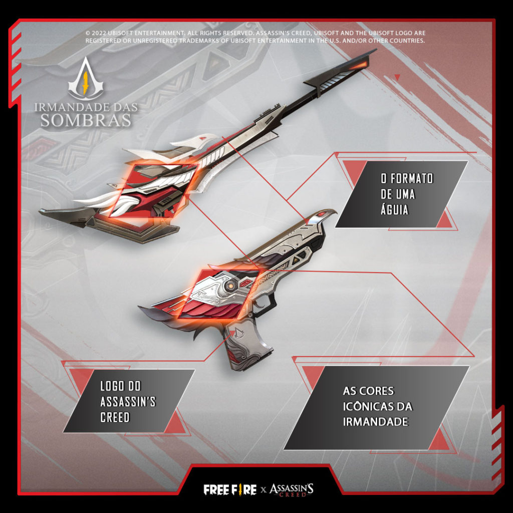 A coleção Free Fire x Assassin’s Creed também incluirá a skin Desert Eagle adornada com a icônica paleta de cores vermelha e branca de Assassin’s Creed, e em formato de falcão com a logo de Assassin’s Creed.