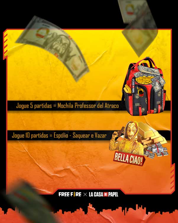 Consistência é a chave! Todos os jogadores ativamente envolvidos na missão de roubo podem esperar uma recompensa no final de tudo. A cada marco desbloqueado, aqueles que completaram com sucesso várias incursões serão recompensados com notas. As notas podem ser trocadas por itens especiais da coleção Free Fire x La Casa de Papel.
