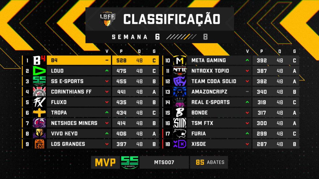 Estamos nos aproximando da reta final da Fase de Grupos da LBFF 6. Neste fim de semana, todas as equipes completaram 48 quedas disputadas e tudo parece começar a se definir. A B4 segue liderando a tabela geral e vem mostrando consistência semana após semana. Eles somaram 117 pontos ao longo do fim de semana de rodada dupla para o Grupo C e, como resultado, se tornou a primeira equipe a ultrapassar a marca de 500 pontos na temporada.