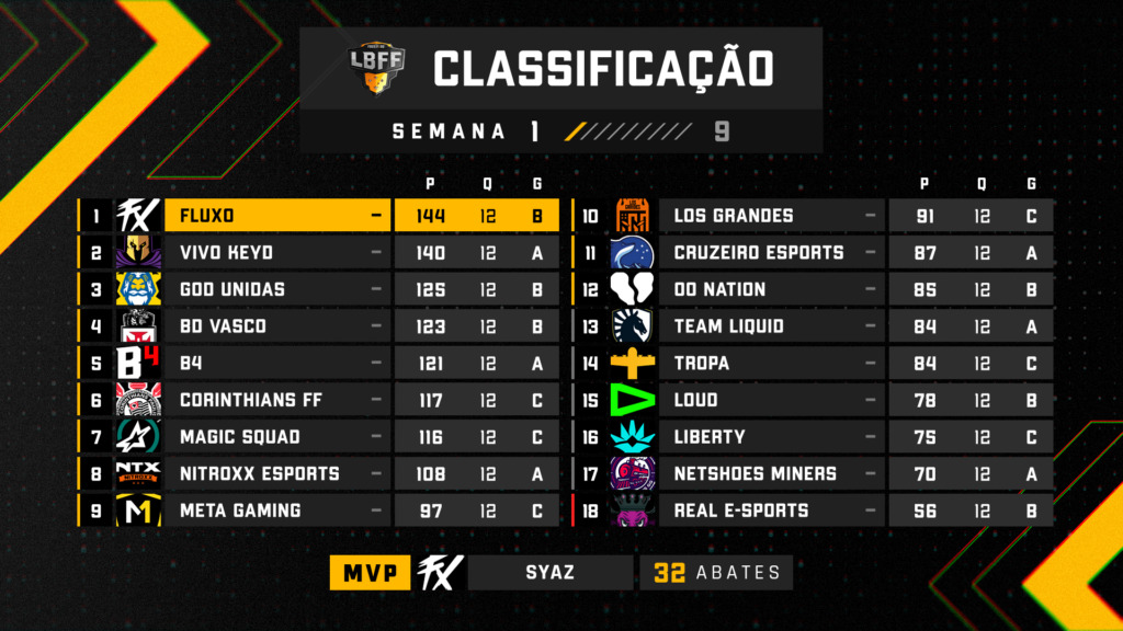 A última rodada, que aconteceu na segunda-feira, foi marcada pelo recorde de Syaz, que estabeleceu um novo marco: 20 abates em uma única rodada. Além do número, o que impressiona é saber que a revelação de 2021 do Fluxo recebeu uma adição de peso, com o recém contratado Ousado também brilhando no primeiro final de semana. O Fluxo manteve a estratégia agressiva e mostrou que não precisa de Booyahs para ser líder: 90 pontos e 48 abates.