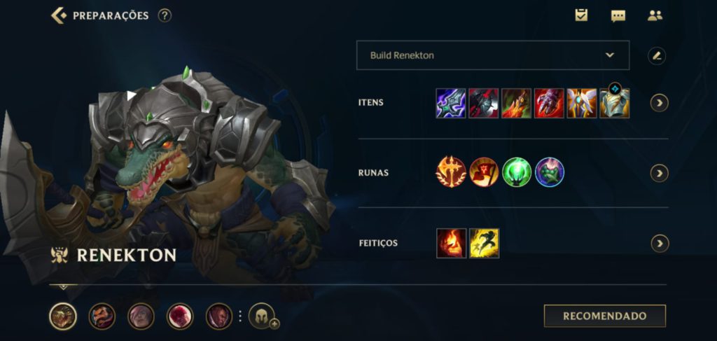 Como escolha de runa principal, o Conquistador tem sido a favorita nas filas ranqueadas. Ela combina muito bem com a característica de Renekton de partir para os combates corpo a corpo, já que concede dano adicional com ataques constantes. Como runas secundárias, Triunfo, Orbe Anulador e Guloseima são uma boa opção. Essas opções te darão dano, resistência, mais cura e ouro adicional de frutoméis. Nas escolhas de Feitiços de Invocador, as mais comuns são o Flash e Incendiar.