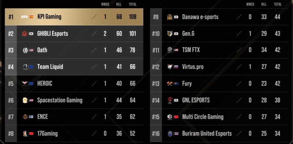 A sul-coreana GHIBLI Esports ficou na 2ª posição da classificação final da Weekly Final, com 101 pontos conquistados, somente 7 atrás da KPI. A norte-americana Oath obteve o 3º lugar, com 78 pontos.