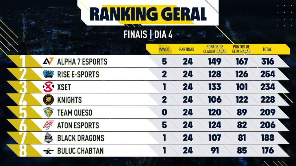 Os times Rise Esports, XSET, Knights, Team Queso, Aton Esports, Black Dragons e Buluc Chabtan ficaram em 2º, 3º, 4º, 5º, 6º, 7º e 8º lugar, respectivamente, conquistando uma vaga para as classificatórias entre os times de LATAM e da Europa. Dos 16 times, seis se classificam para a PMGC, concorrendo ao título de melhor time de PUBG Mobile do mundo e uma parte dos US$ 6 milhões.