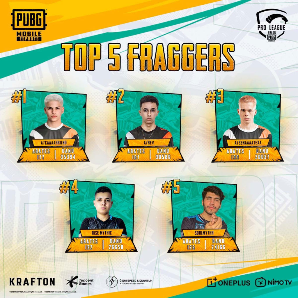 Alpha7 coleciona títulos e dessa vez além de ser a grande campeã da competição, também teve os quatro jogadores no TOP 10 dos MVPs do campeonato. Além do 1º lugar, com 177 abates e 35.394 de dano, Carrilho atingiu o número de mil abates em sua carreira em campeonatos oficiais do PUBG Mobile.