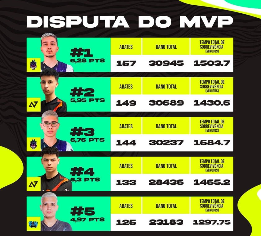 Até a final mantivemos praticamente o mesmo Top de jogadores no Ranking MVP do campeonato. Federal e LilBoy pela Influence Rage, Revo e Carrilho pela Alpha7, Mythic pela Rise e Toico e Cardozin pela Loops. A briga se mantém acirrada entre Federal e Revo para decidir quem vai levar o título de MVP da PMPL Brasil Spring ’22 e a premiação extra de US$ 1 mil.