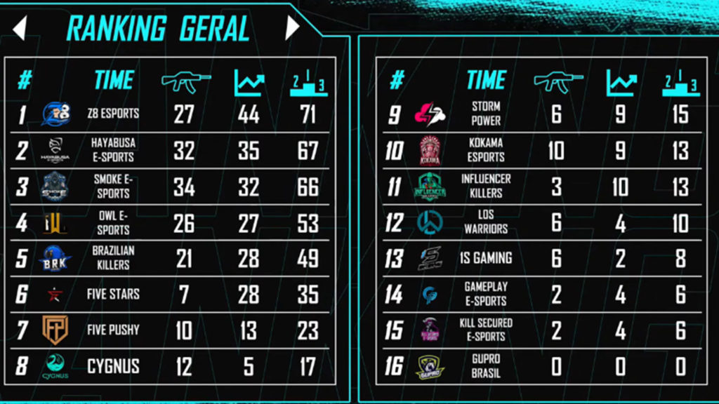 A Hayabusa e-Sports ficou em 2º lugar, o Smoke e-Sports em 3º e a Owl e-Sports em 4º, com 67, 66 e 53 pontos, levando a premiação de R$ 3 mil, R$ 2 mil e R$ 1 mil, respectivamente. Os times do 5º ao 8º lugar, foram premiados com R$ 500. A Copa Sem1 é um torneio inteiramente nacional, focado na comunidade e times amadores, dando oportunidade para a descoberta de novos talentos para o competitivo do PUBG Mobile.