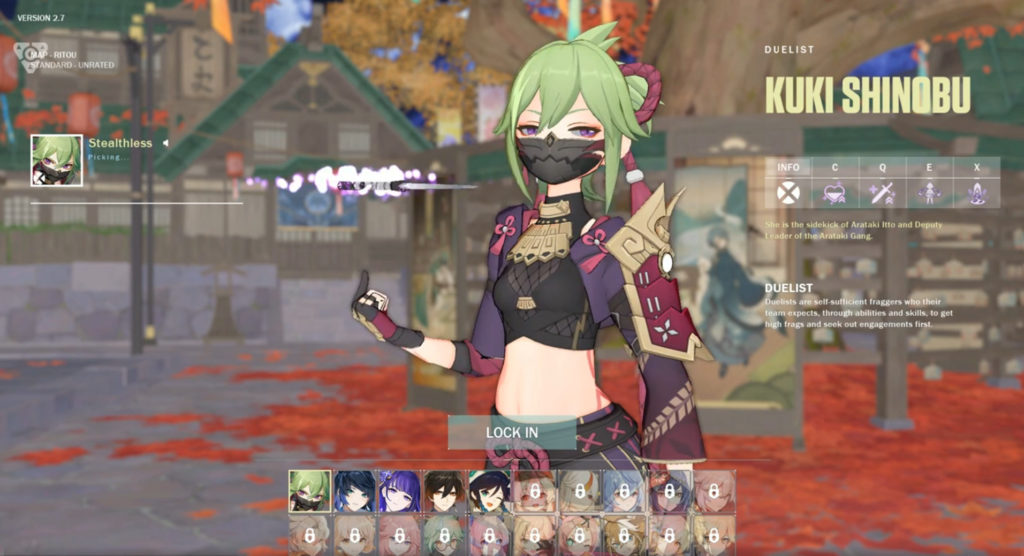 Dessa forma, as semelhanças entre Genshin Impact e VALORANT ficam mais visíveis quando o player seleciona a personagem Kuki, que tem uma animação parecida com a da Jett e mesma função (duelista). A agente chega correndo de costas para o jogador e girando sua kunai no ar. As habilidades foram personalizadas e organizadas no lado direito, com determinadas especificações, além das keybinds programadas para cada uma.