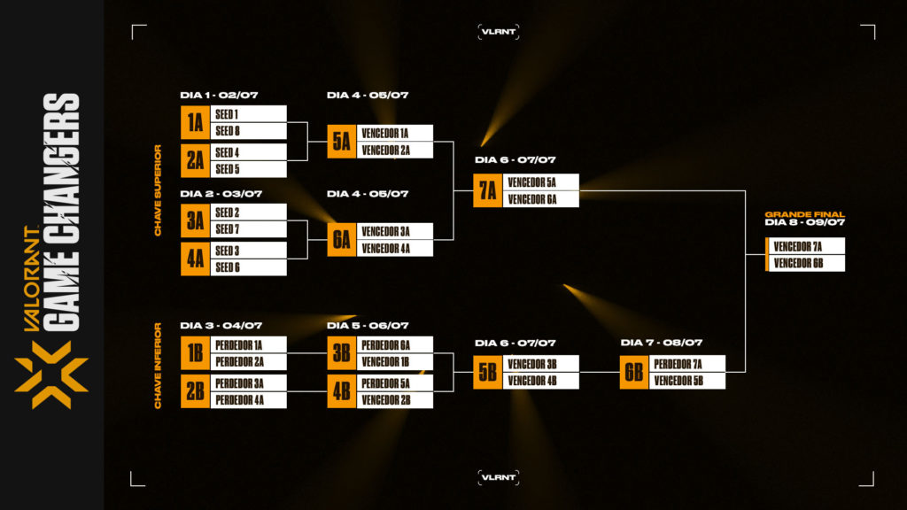 O VCT Game Changers seguirá o formato de eliminação dupla e irá acontecer entre os dias 2 e 9 de julho. Todos os confrontos serão em MD3 (melhor de três), com exceção da final da chave inferior e a grande final, que serão realizadas em MD5 (melhor de cinco). Confira quais são os dias de disputa para cada chaveamento.