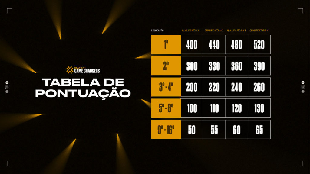 É importante destacar que, a cada etapa qualificatória do VCT Game Changers, o número de pontos de circuito distribuídos aumenta. Isso faz com que a última etapa seja a mais decisiva. Segue tabela que ilustra a distribuição.