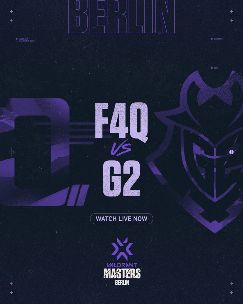 O segundo duelo foi entre a equipe europeia, G2 Esports e a sul coreana, F4Q. Ambas as equipes estão no grupo D, que possui apenas três equipes. Por conta disso, esse foi apenas o primeiro duelo entre os dois times (não sabe o que estamos falando? Confira o nosso Guia do VCT Masters Berlim).