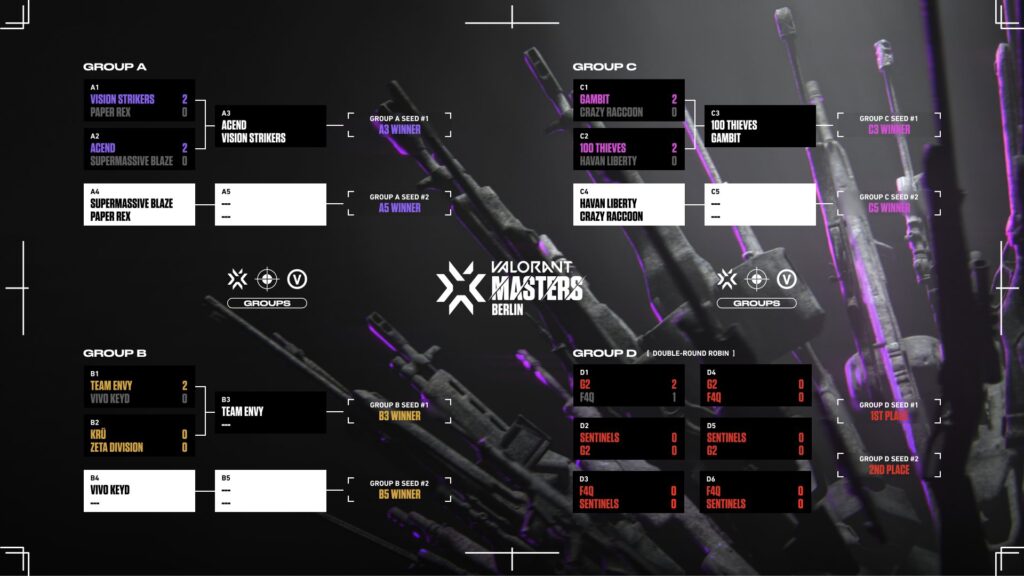 Agora, Visions Strikers irá enfrentar a Acend no dia 13 de setembro, às 13h, buscando uma das vagas para os playoffs. Já a Paper Rex irá enfrentar a SuperMassive Blaze, no dia 15 de setembro, às 10h – a equipe que perder o confronto estará desclassificada do VCT Masters.