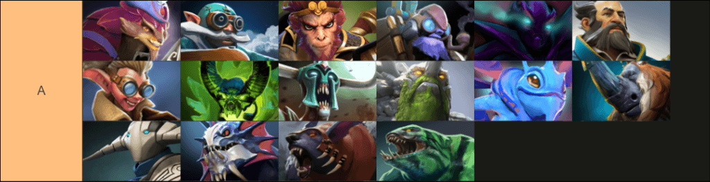 Os heróis de nível A ganham partidas, possuem habilidades quebradas (no sentido de que estão fortes demais) no momento ou fazem algo tão bem que é muito difícil de perder com eles. Alguns, como o Tidehunter, tem um ultimate que muda o rumo das partidas. Undying, como Phoenix antes, está passando pelo buff "Labirinto de Aghani", onde os jogadores habilidosos com Undying estão surgindo muito mais à medida que as pessoas finalmente entendem como usá-lo. E depois há heróis como Spectre, que são apenas muito bons no cargo Carry.