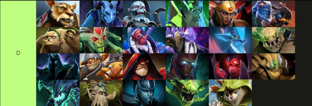 Fundamentalmente, há algo com cada um desses heróis que os torna ruins no jogo hoje, seja balanceamento, falta de conhecimento de jogo dos jogadores que os usam ou outra coisa. Por exemplo, Meepo está neste nível, porque apesar de um jogador Meepo altamente qualificado poder fazer a diferença, não há razão para jogar com Meepo ao invés de com qualquer um dos heróis dos níveis S, A, B, etc. Você terá bem mais chances de ganhar.