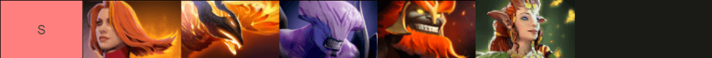 Os heróis de nível S devem estar vencendo tudo no meta atual. Se você quer ganhar partidas, escolha esses heróis. Lina é simples de jogar e muito mais forte do que sua dificuldade sugeriria na atualização atual. Phoenix está passando pelo efeito "Aghanim", onde ser forte nesse modo lembrou aos jogadores habilidosos que esse herói existe e deve ser escolhido.