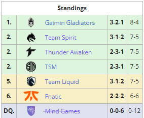 Todas as equipes foram estáveis e garantiram várias vitórias, empates e derrotas. Isso nos levou a um ponto em que um desempate de 6 vias poderia ter acontecido. No entanto, depois que o Gaimin Gladiators venceu a Fnatic por 2 a 0, garantindo seu primeiro lugar no ranking, resolvemos com um desempate de 4 vias.