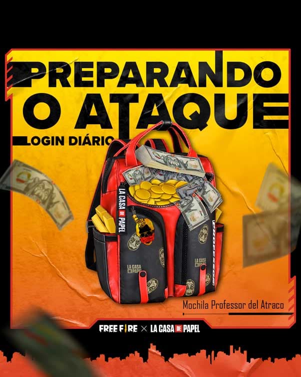 Fãs e jogadores não vão querer perder todas as recompensas e itens especiais disponíveis no dia 11 de dezembro! Neste dia, serão distribuídas pranchas especiais Free Fire x La Casa de Papel gratuitamente, para os usuários que fizerem login no jogo. Também será entregue o Espólio Saquear e Vazar a cada dez partidas disputadas e a Mochila Professor Del Atraco a cada cinco partidas disputadas entre os dias 11 e 12 de dezembro.