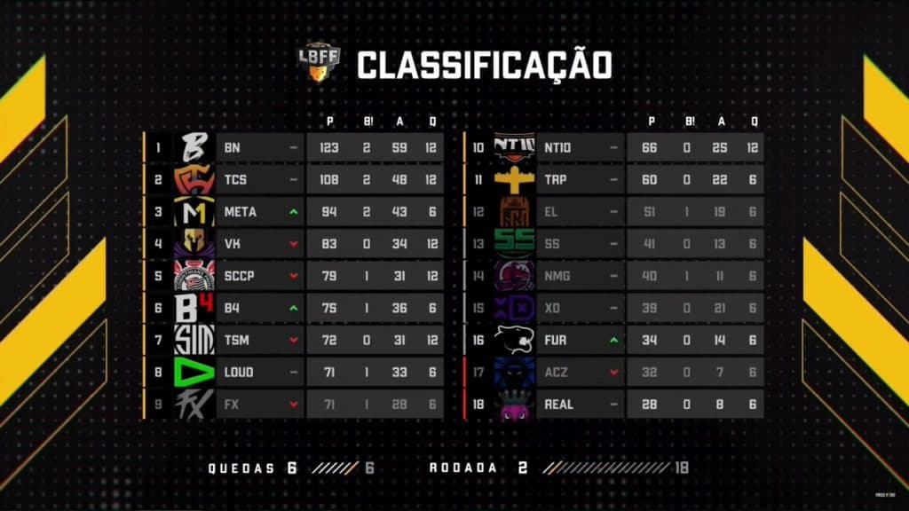 A Meta Gaming foi a equipe que mais se destacou nesta segunda rodada. O time, que ingressou na série A na LBFF 4, vem mostrando desempenho consistente desde que chegou na elite do Free Fire Brasileiro. Na última edição da competição, o time paraguaio disputou a final e terminou a grande disputa entre as cinco melhores equipes.