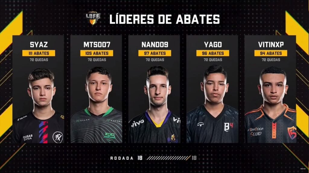 Nando9, da Vivo KEYD, liderou sua equipe na segunda-feira com expressivos 18 abates. Como resultado, o suporte dos Guerreiros assume o top 3 da disputa, com 97 eliminações. Yago, da B4, e VitinXP, da Team Coda Solid, completam o top 5.