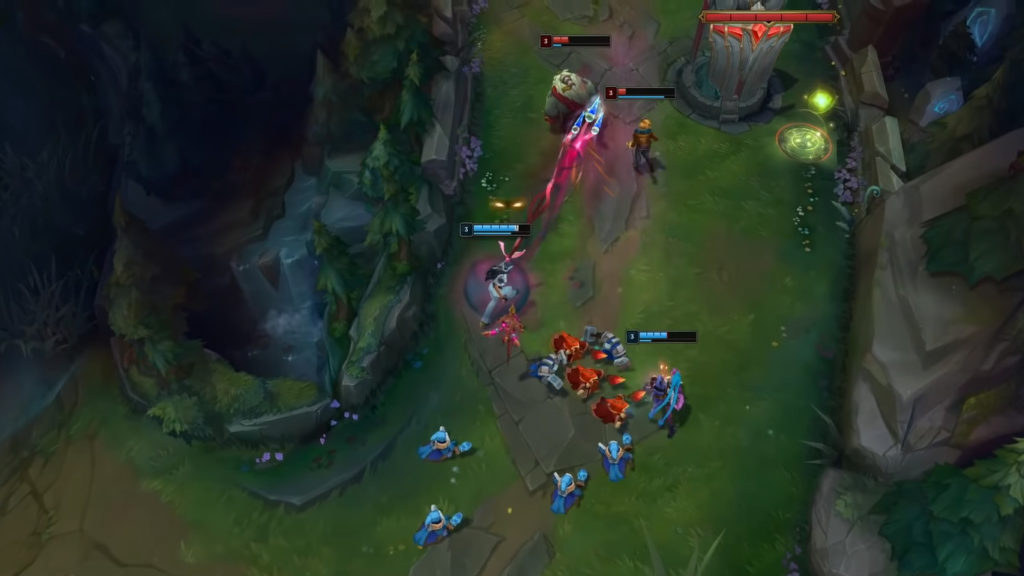 O W é uma das habilidades mais importantes de se utilizar corretamente com Renata. Com ela, você pode dar buffs de velocidade de ataque e de movimento, mas seu detalhe mais forte é que você pode dar uma sobrevida aos seus aliados ou a si mesmo depois de ser abatido. Se o seu companheiro conseguir uma eliminação com a habilidade ativa, ele volta a vida em definitivo. Sabendo isso, é importante utilizar seu W tanto no começo de trocas, também combando com seus ataques da passiva, quanto também guardando a habilidade para o caso de precisar manter seu aliado de pé.