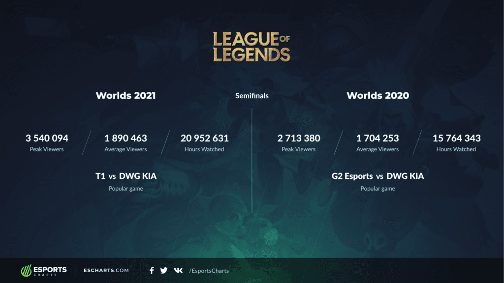 The Worlds 2021 viewership figures could increase though, as we have yet to have the Grand Finals. Two years ago, the Worlds 2019 peak of 3.9 million, the 2nd highest of all time, came during the Grand Finals.