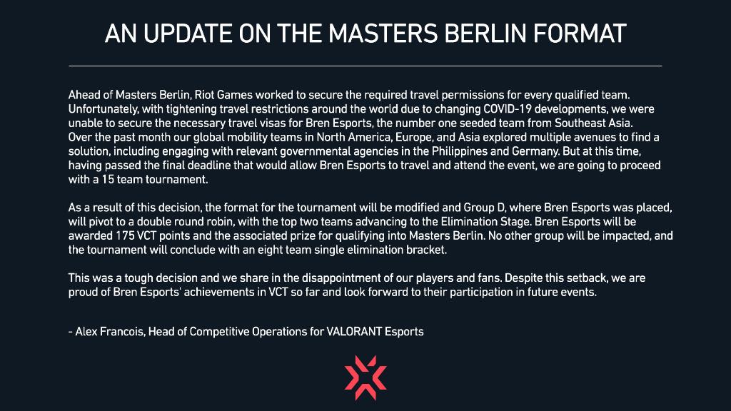 Der südostasiatische Meister Bren Esports kann aufgrund von Visaproblemen leider nicht am Masters Berlin teilnehmen. Die Gruppe D wird in ein 3er-Round-Robin-Format umgewandelt.