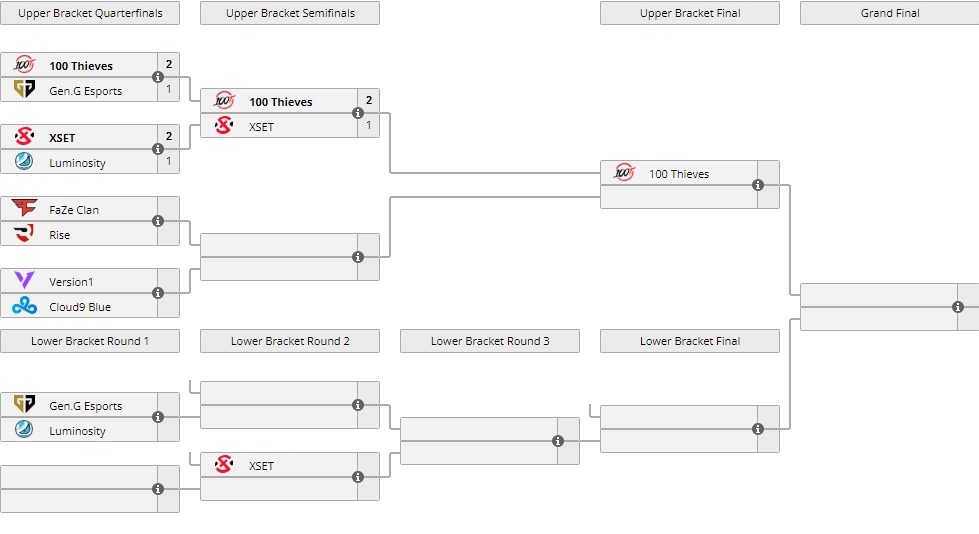 Was das für die bereits ausgetragenen Spiele bedeutet, ist noch nicht bekannt. 100 Thieves steht derzeit im Halbfinale des Upper Brackets, nachdem sie sowohl XSET als auch Gen G besiegt haben. In dem Lower Bracket treffen Gen G und Luminosity aufeinander. Der Rest der ersten Runde muss noch gespielt werden.