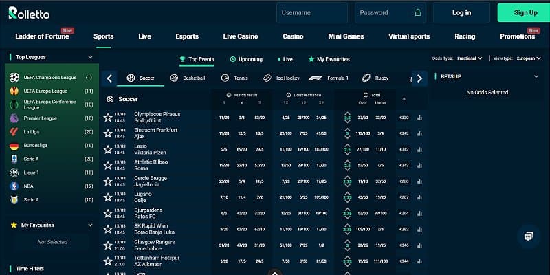 Rolletto’s interface is slick and fuss-free, with large menus easy on the eye on all devices. Thanks to a neatly organised homepage, you should have no trouble finding a sport, competition, or betting market.