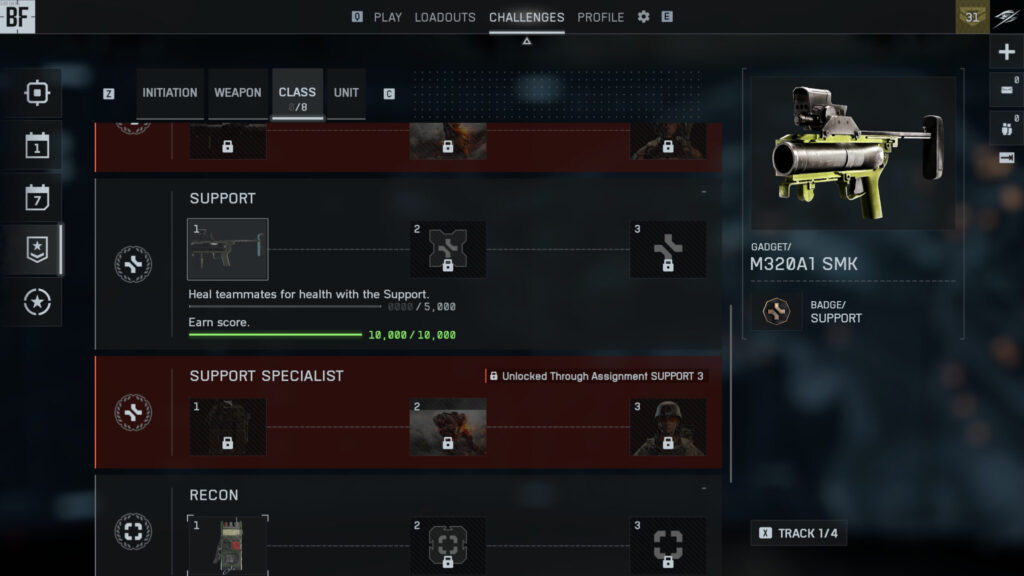 For starters, this challenge is found under the “Class” section of the Assignments tab within the challenges menu in Battlefield 6. Scroll down until you see “Support,” and the challenge is associated with unlocking the M320A1 SMK Gadget.