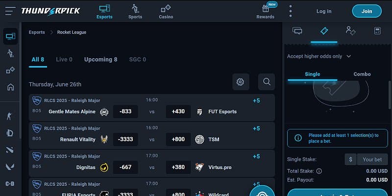 Thunderpick is up next, an esports-first gambling site that offers the best depth of Rocket League betting markets in the industry.