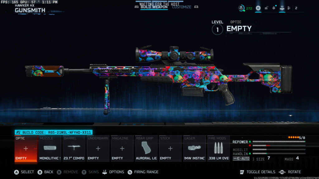 We’ve decided to go with a mix of damage range, bullet velocity, and mobility for the Hawker HX loadout. Mobility is increased with the Auroral Light Grip and the 1MW Instinct Laser, both of which increase aim down sight speed and sprint-to-fire time. Then, we have the Monolithic Suppressor, 23.7″ Composite-11 Barrel, and .338 LM Overpressured to improve damage range and bullet velocity.