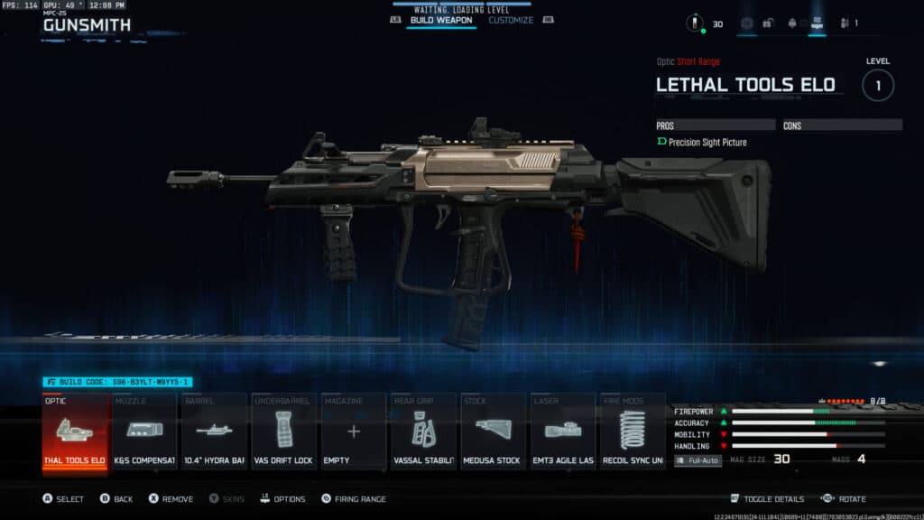As you can see, we've opted to use the Gunfighter Wildcsrd to give us eight attachments for the loadout. The MPC-25 desparately needs help with recoil control, so we've allocated nearly every attachment slot to boosting accuracy. The exceptions are the 10.4" Hydra Barrel, giving extra damage range and bullet velocity, and the Lethal Tools Elo optic. The optic is personal preference, but we find the MPC-25's iron sights to be a little too jarring to use.
