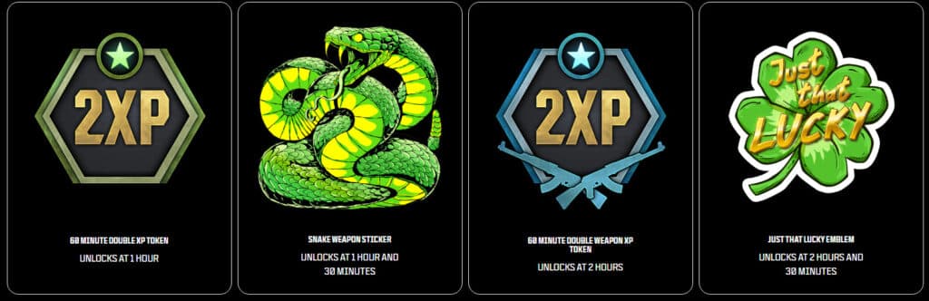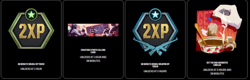- 2 hours and 30 minutes: 1 Hour Double Weapon XP token