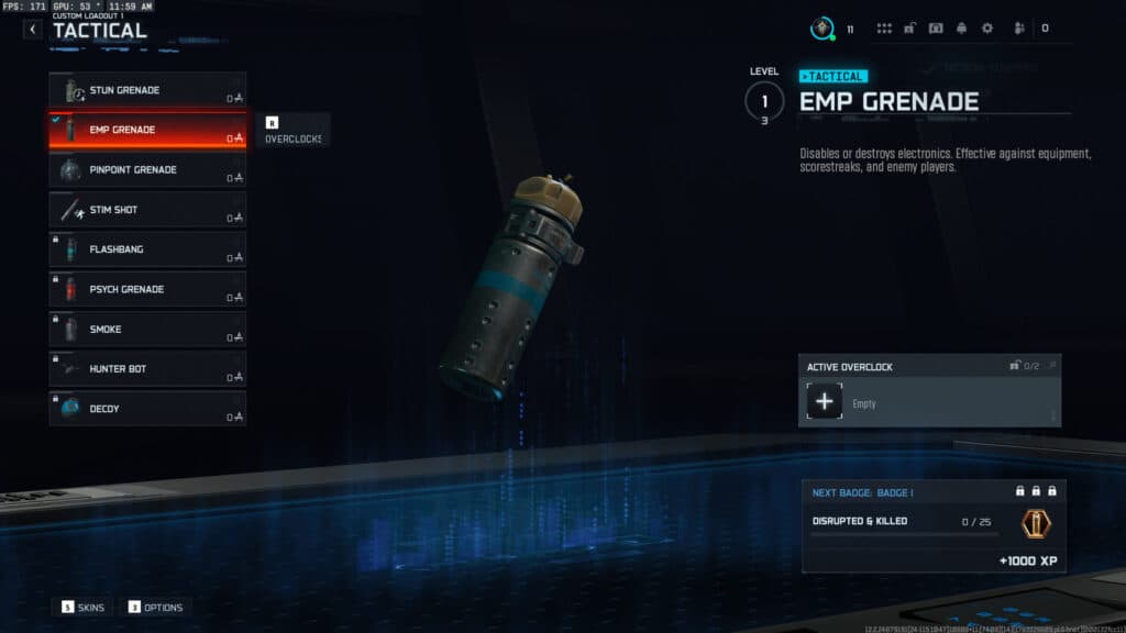 - Go to your loadouts and equip the EMP Grenade in your Tactical Equipment slot
