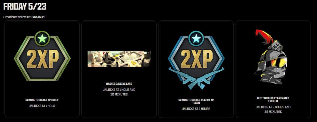 The in-game items available to acquire include double XP tokens, Calling Cards, and even a weapon blueprint. You must watch the broadcast for some time to receive these items, which we have outlined below.