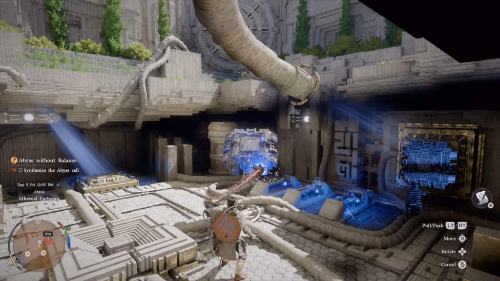 This allows you to enter the bottom pit, where you can observe the Force Palm skill tutorial on the blank cell wall. Go up to the cutscene, observe it using LB/L1, and then you can use Axiom Force to move the floating Abyss Cell to the wall. Once the cell is in position, use your new Force Palm skill by holding RB/R1 near the cell, and then let go of the button to attach the cell to the wall.