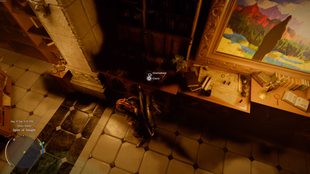 After examining the book, go behind it and to the right. On a desk, you’ll find a Gravestone. Interact with it to carry it and then place it inside the bowl in front of the large book. This activates the platform, and you can now press the blue button in front of the platform. Head up on the platform and ride it up to the next floor.