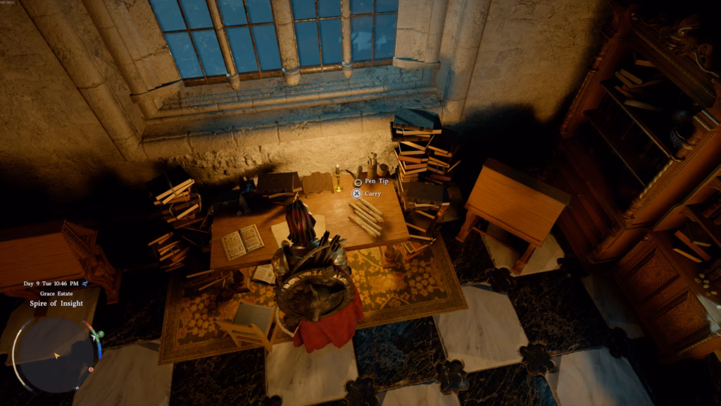 - Turn around from the platform and go to the left. You’ll find a doorway with a desk inside. On the desk, carry the “Pen Tip” and place it in the bowl