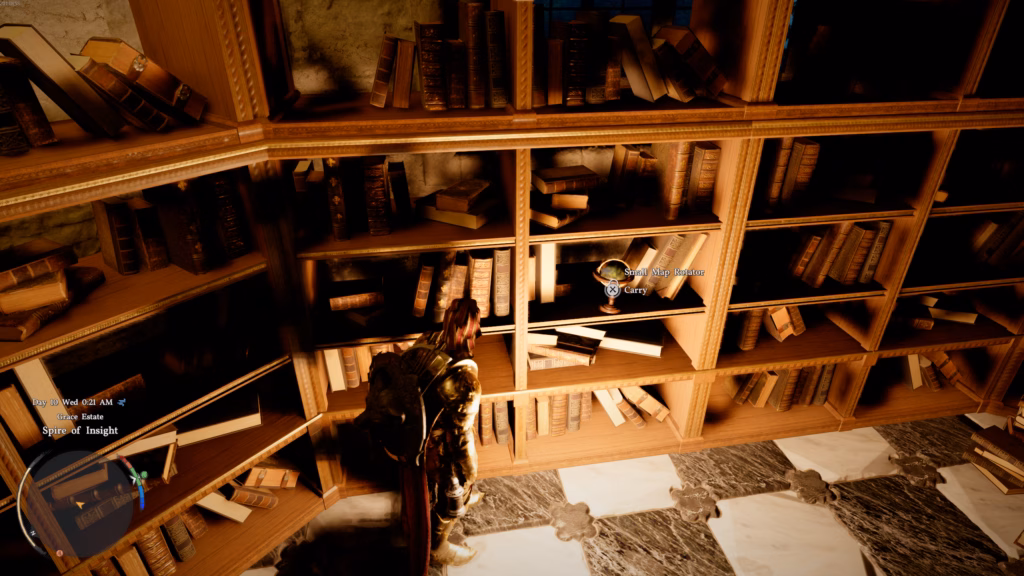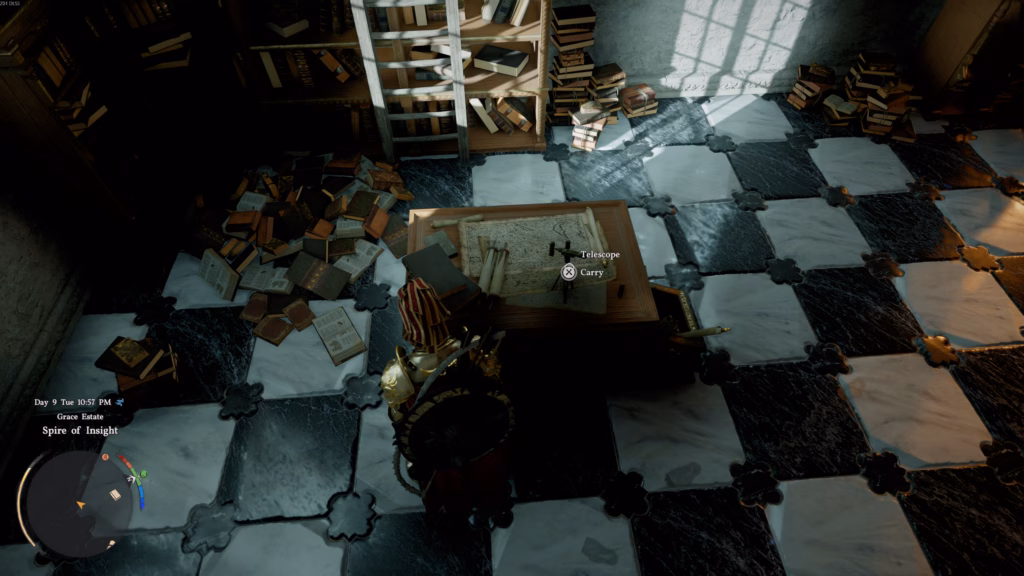 Finally, we arrive at the third floor. This time, you need three items to place in the bowl, but luckily, the room is small. You’re looking for a Celestial, which is found on top of some books, a Small Map Rotator, which is found on the third shelf of a bookshelf, and a Sundial, which is found near a ladder on a bookshelf.