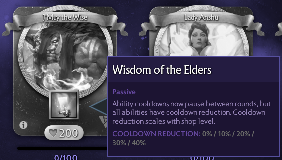 Another really unique God is J’muy the wise. This god has the ability to reduce cooldowns by 50% at max level. However, the cost is that cooldowns are not reset at the end of each round. So, this benefits a lot of the medium to short cooldown spells like Paralyzing Cask, Wild Axes or Nethertoxin. However with longer cooldowns which are typically the good ultimates like Chain Frost might suffer.