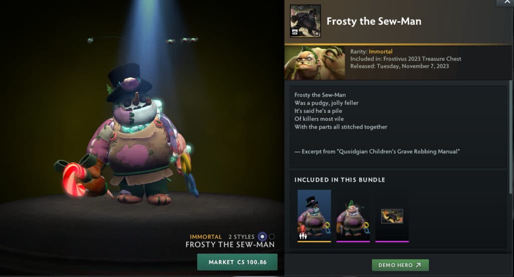 The 2023 Frostivus Dota 2 event has five tiers of rewards available in it's treasure trove. New sets from the Frostivus treasure like Pudge's Frosty the Sew-Man Persona bundle or Ancient Apparition's Silent Wight set, as well as returning sets like Techies' Powdersled Rookery or Tiny's Frostmoot bundle are available in tiers one through two. There's a total of 21 different sets within the first two tiers. While the upper tiers, as in three or more all feature brand new immortals and bundles. Of which, is the new Frostivus Frosty the Sew-Man bundle for the Pudge Persona.
