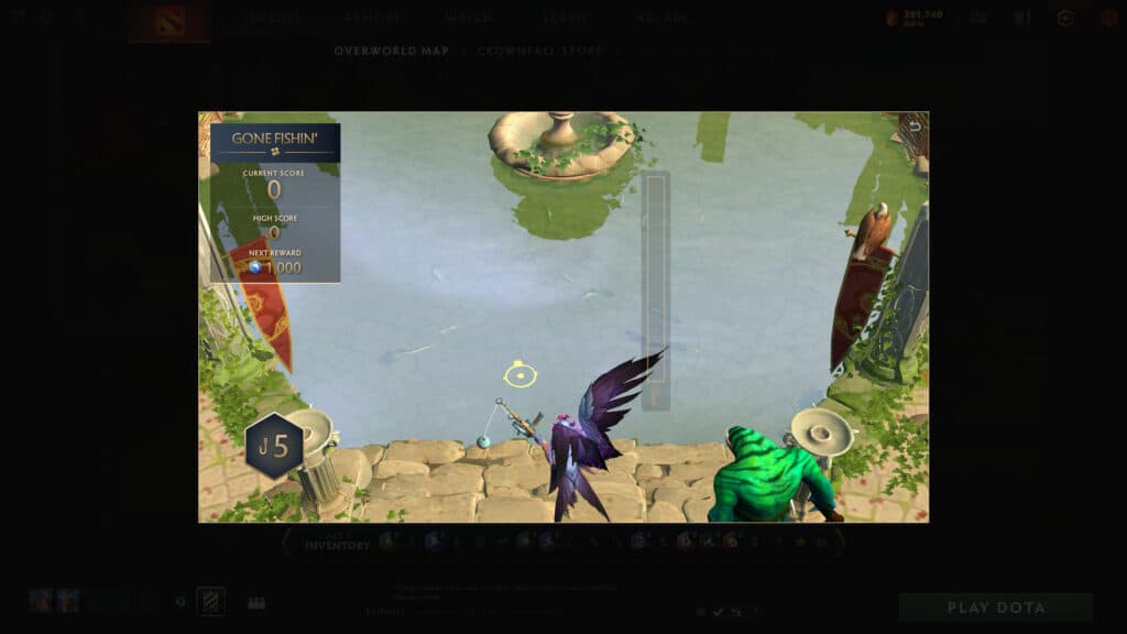 Along the path of Crownfall's Main Quest, you will unlock the fishing game which represents a fish hook symbol on the map. This is a mini-game that allows you five rounds of fishing. The rarer the fish you catch, the more points you will get.