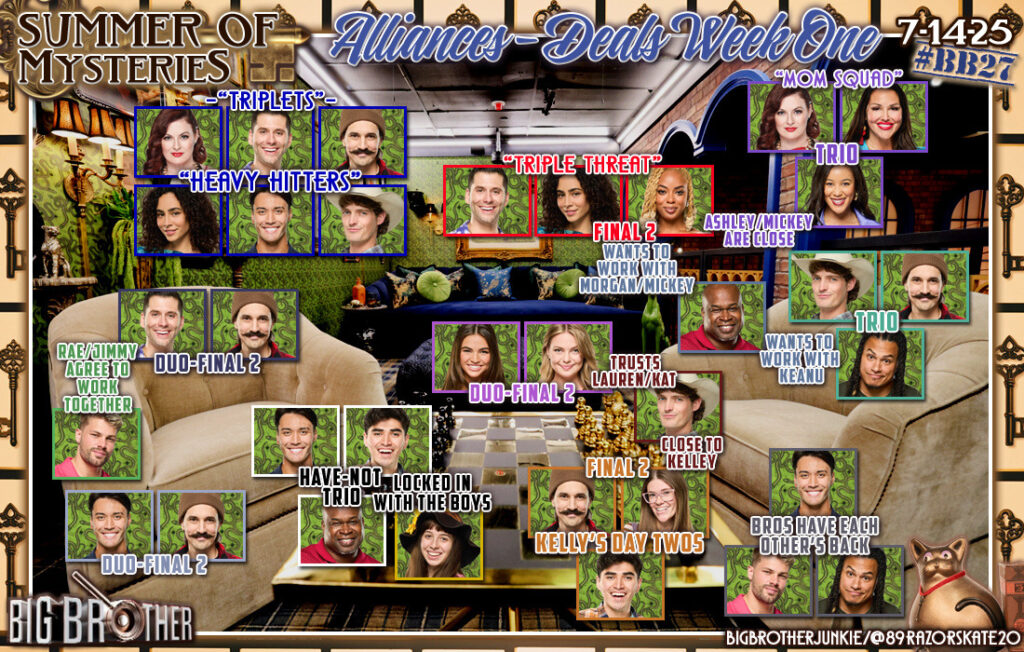 Just like the first couple of weeks of any season, it can be difficult to keep full track of who is working together, what alliances have formed, and what deals have already been made. Fortunately, the BB community is excellent when it comes to breaking down the house and how it’s shaking out. Below, you can see a full alliances and deals map for the first week of Big Brother 27.