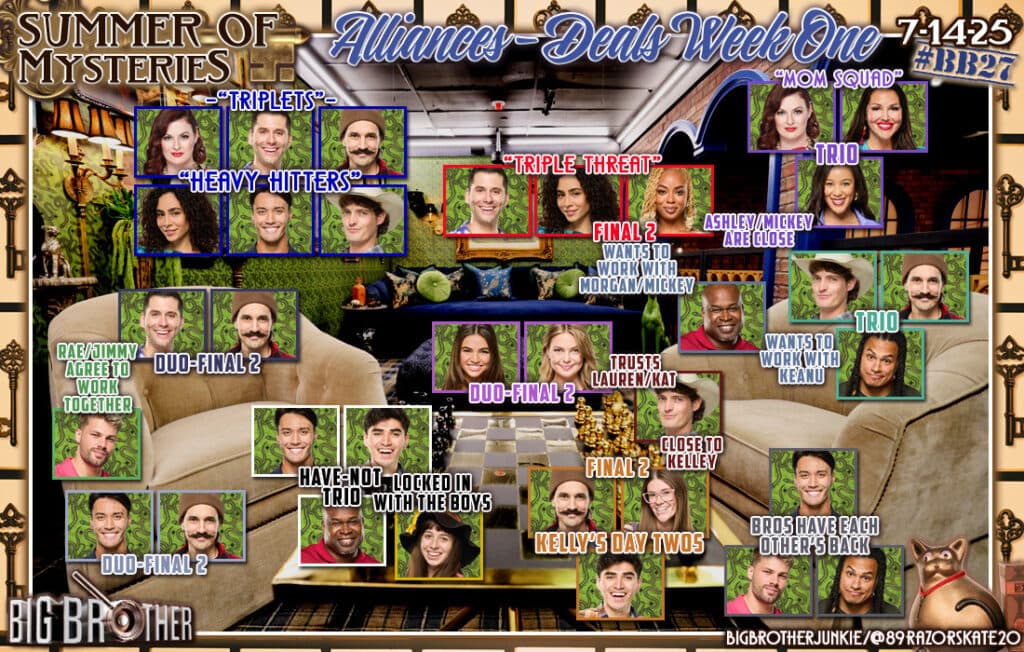 Just like the first couple of weeks of any season, it can be difficult to keep full track of who is working together, what alliances have formed, and what deals have already been made. Fortunately, the BB community is excellent when it comes to breaking down the house and how it's shaking out. Below, you can see a full alliances and deals map for the first week of Big Brother 27.