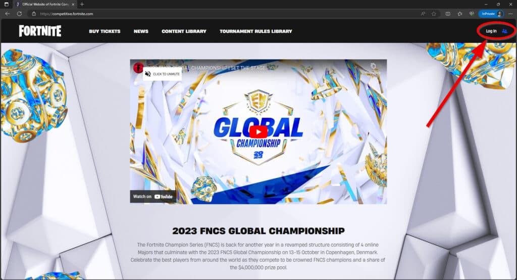 For the first option, you must head to the competitive.fortnite.com website, where Epic Games hosts the FNCS Global Championship broadcast. Once there, all you need to do is ensure that you are logged in to your Epic Games account. Then, you will progressively unlock the FNCS Global Championship drops throughout the weekend.