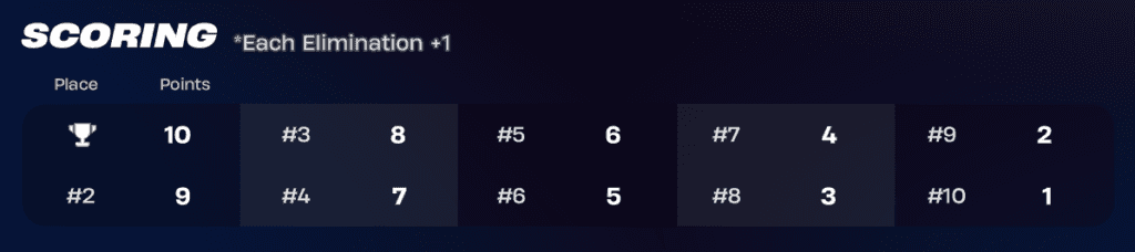 - Competitors will earn points via eliminations and placement